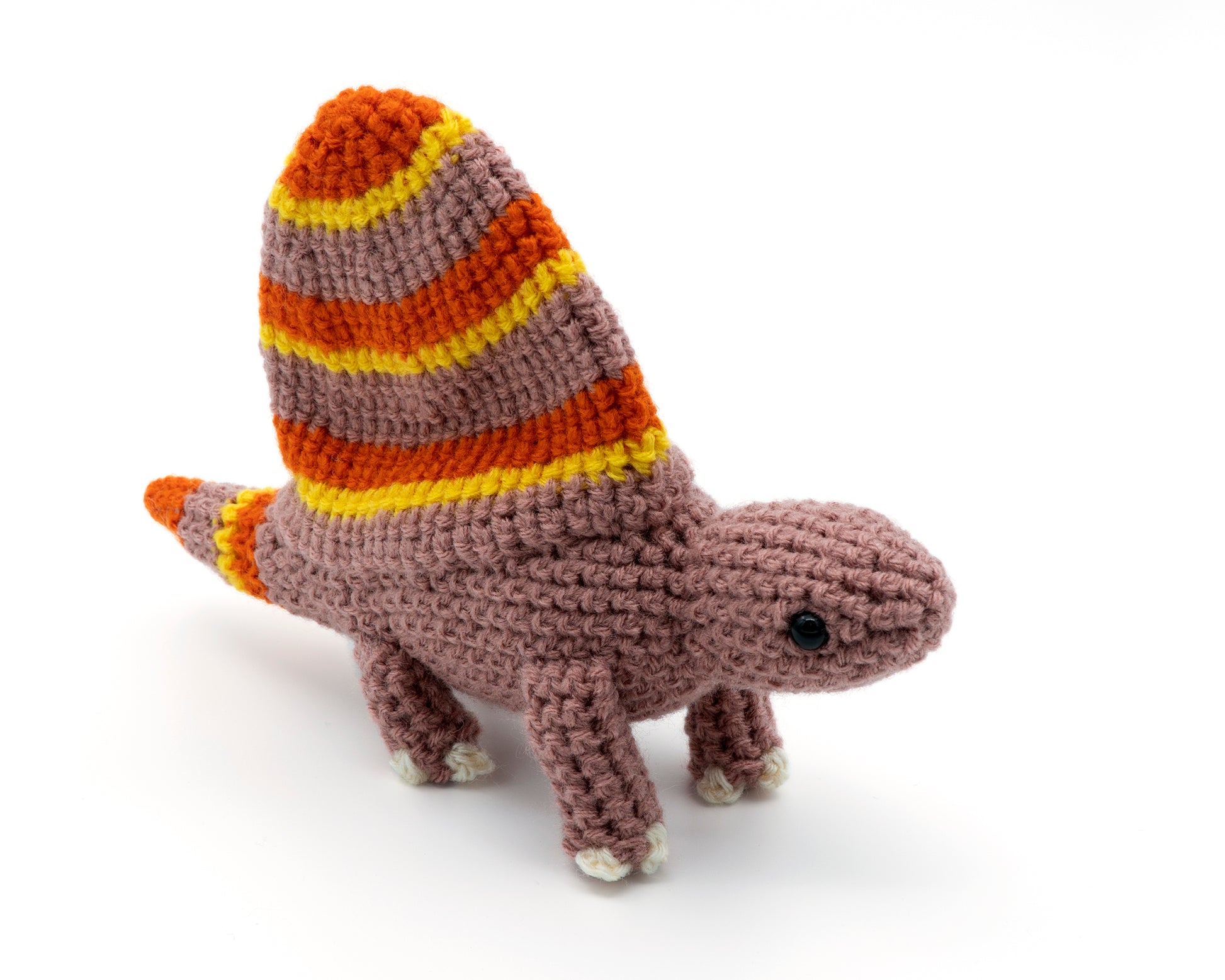 If the recommended size yarn and hook are used this crochet Dimetrodon will be approximately 13.3 cm (5.25 inches) tall including the sail by 21.6 cm (8.5 inches) long.