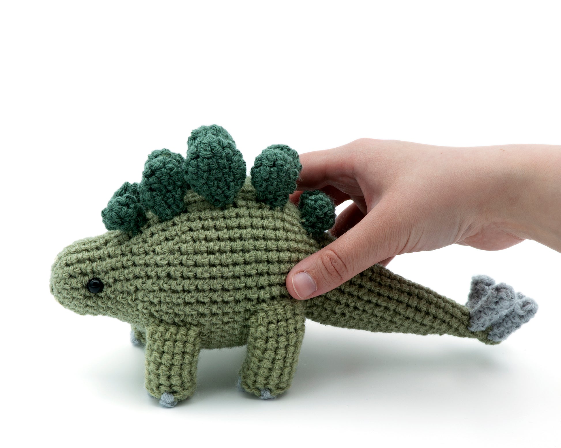 If the recommended size yarn and hook are used this crochet Tyrannosaurus will be approximately 12.7 cm (5 inches) tall including the spikes by 22.8 cm (9 inches) long.