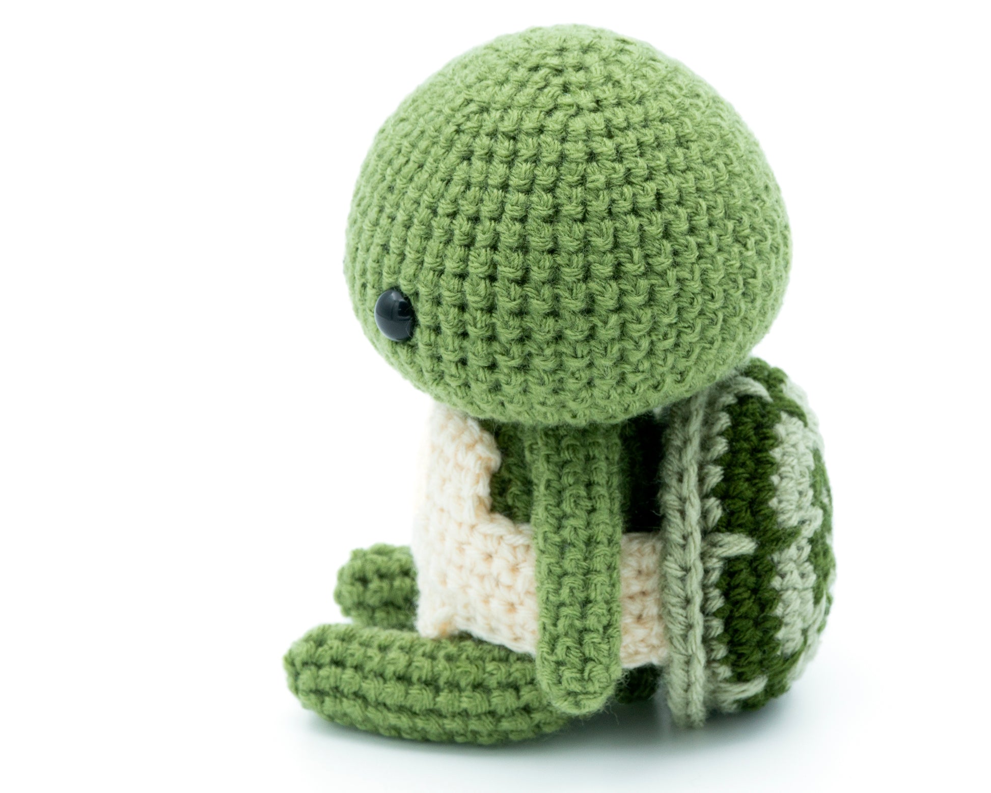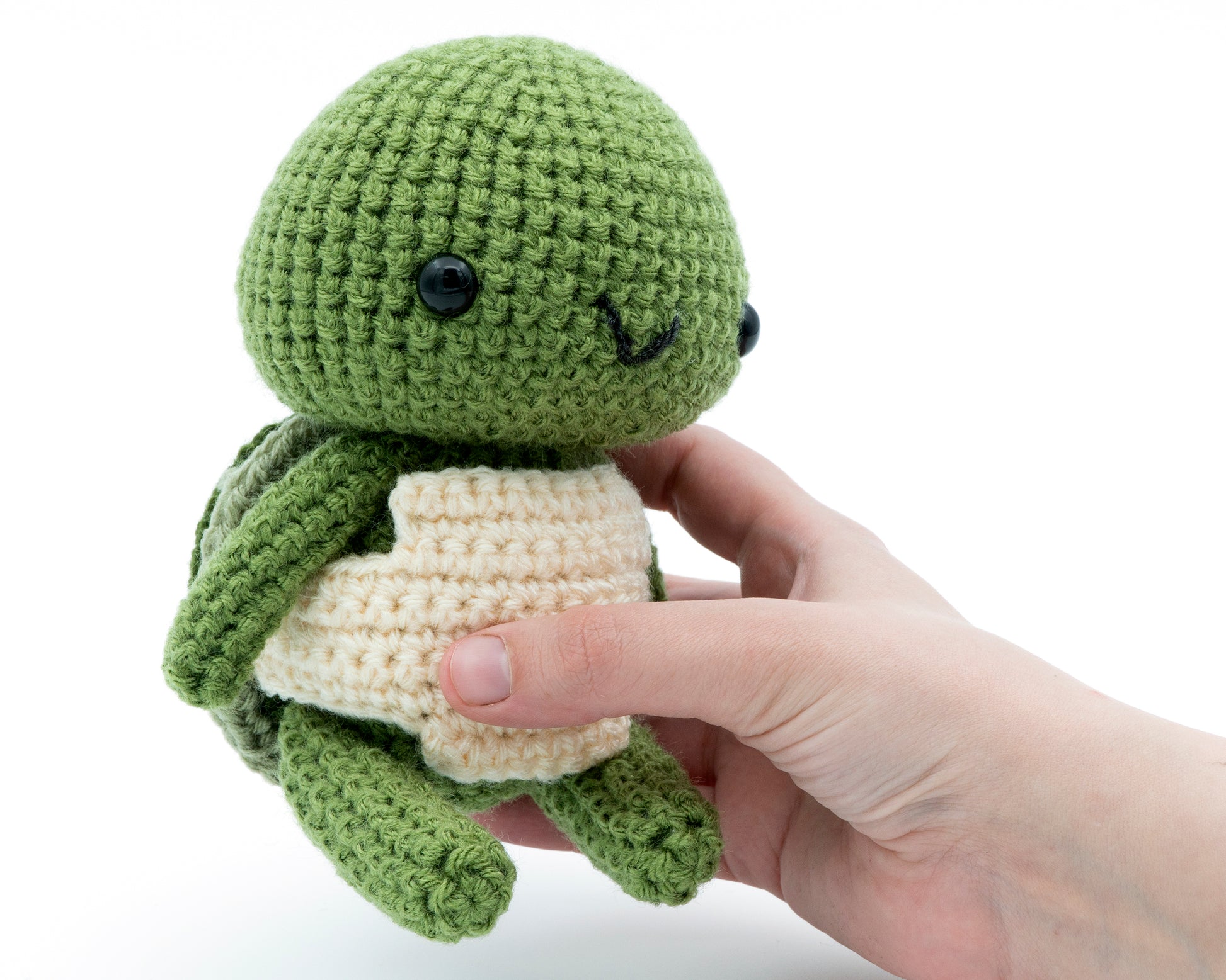 If the recommended size yarn and hook are used this crochet turtle will be approximately 13.9 cm (5.5 inches) tall by 10.1 cm (4 inches) wide.