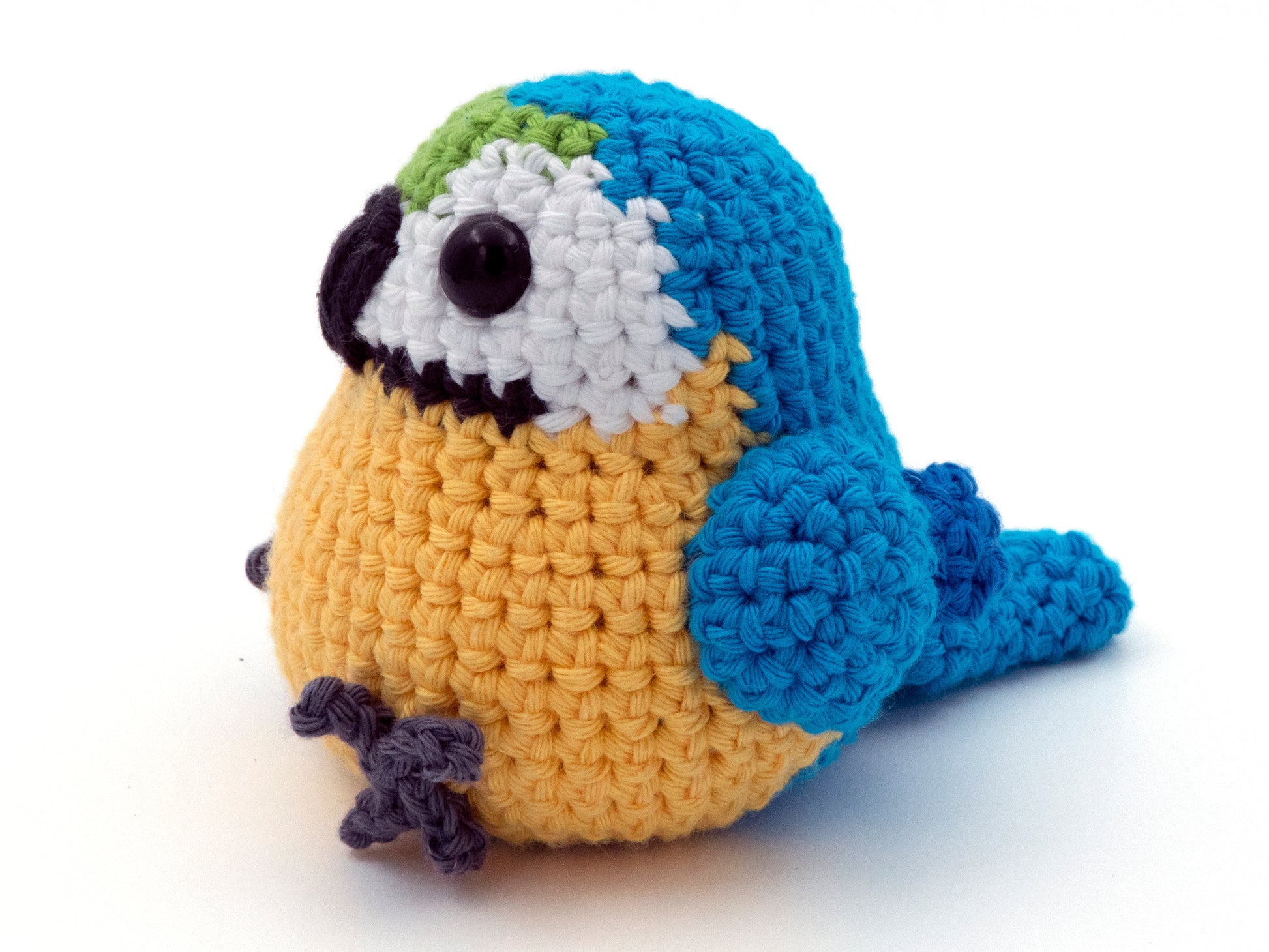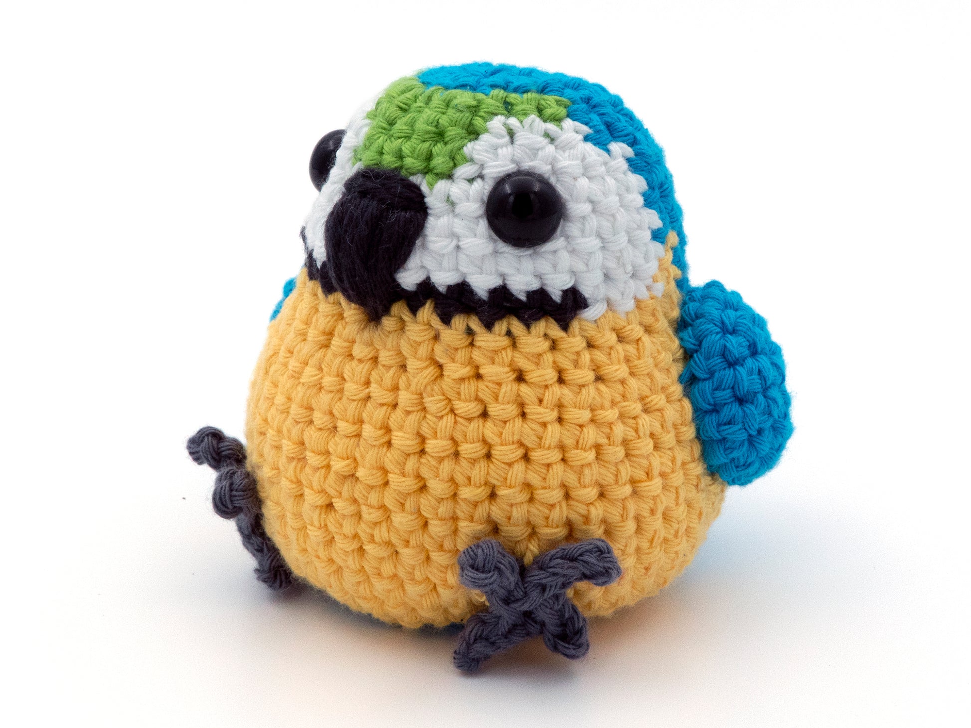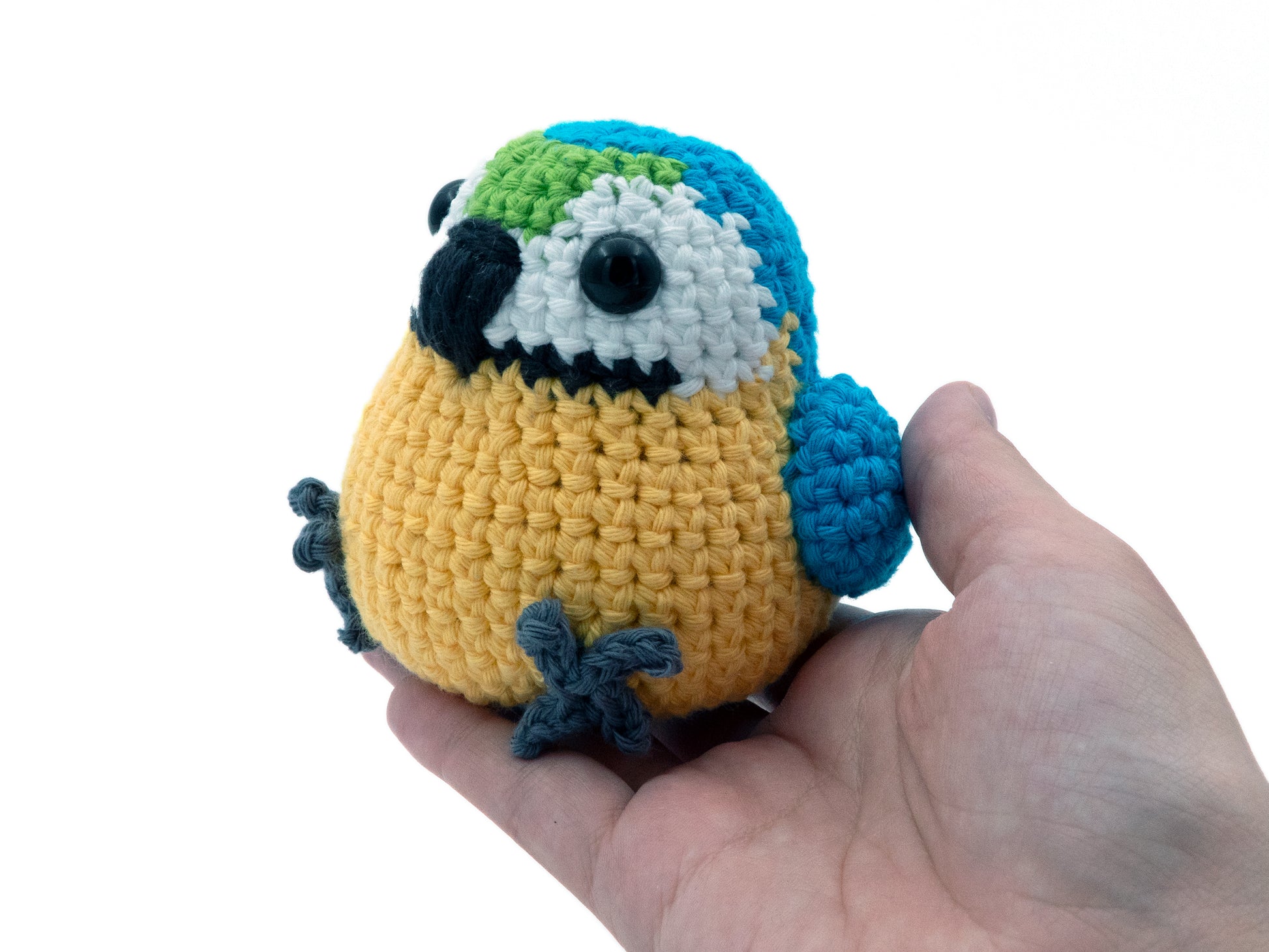 If the recommended hook and yarn size are used this Blue and Gold Macaw plush will be approximately 10 cm (3.9 inches) tall and 10 cm (3.9 inches) wide.