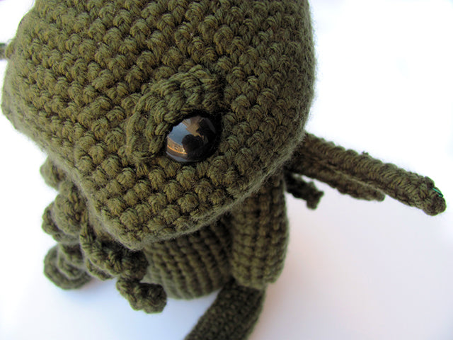 If the recommended size yarn and hook are used this amigurumi Cthulhu plush will be approximately 19cm (7.5 inches) tall while sitting, by 12.7cm (5 inches) wide.