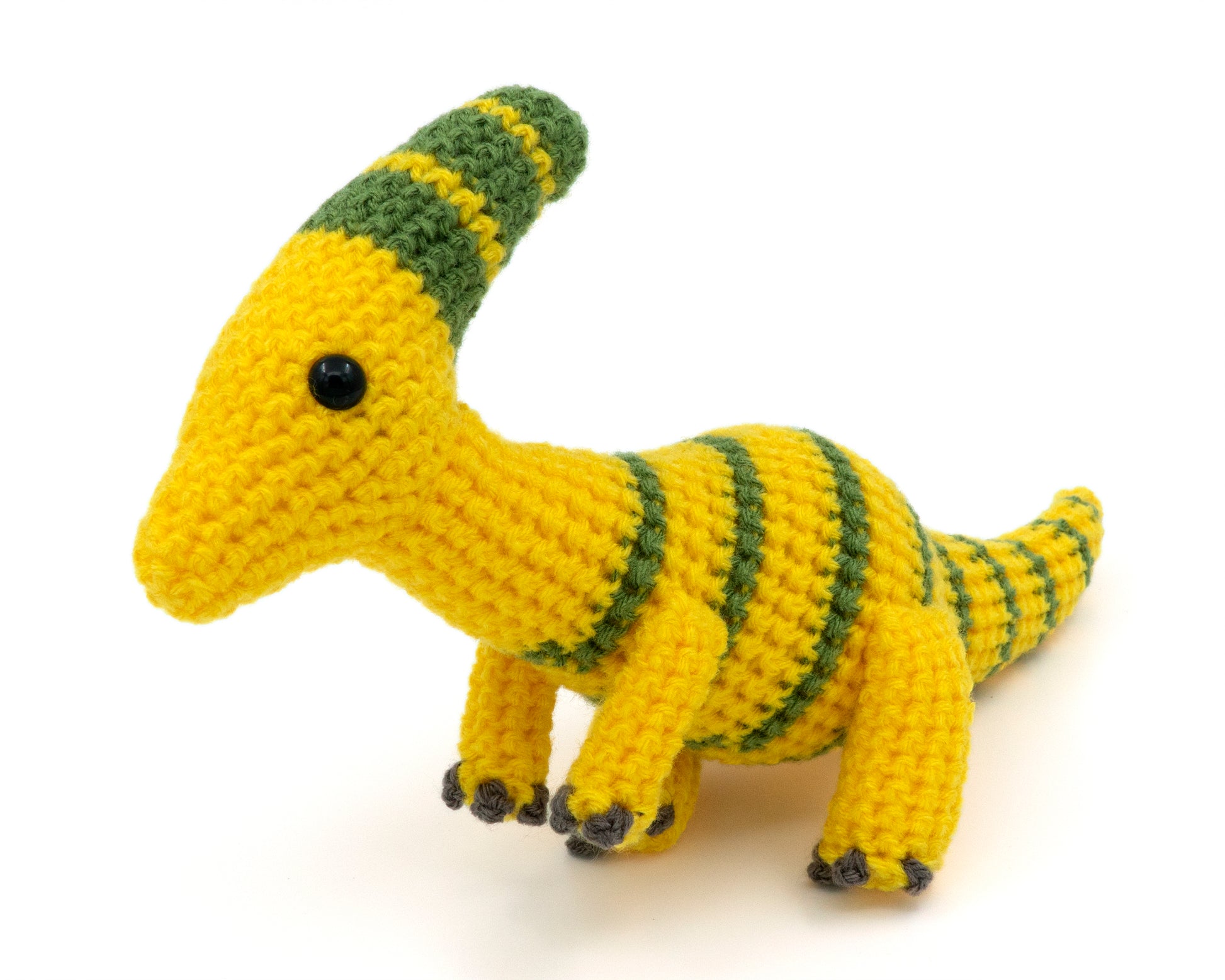 If the recommended size yarn and hook are used this crochet Parasaurolophus will be approximately 16.5 cm (6.5 inches) tall while on hind legs by 29.2 cm (11.5 inches) long.