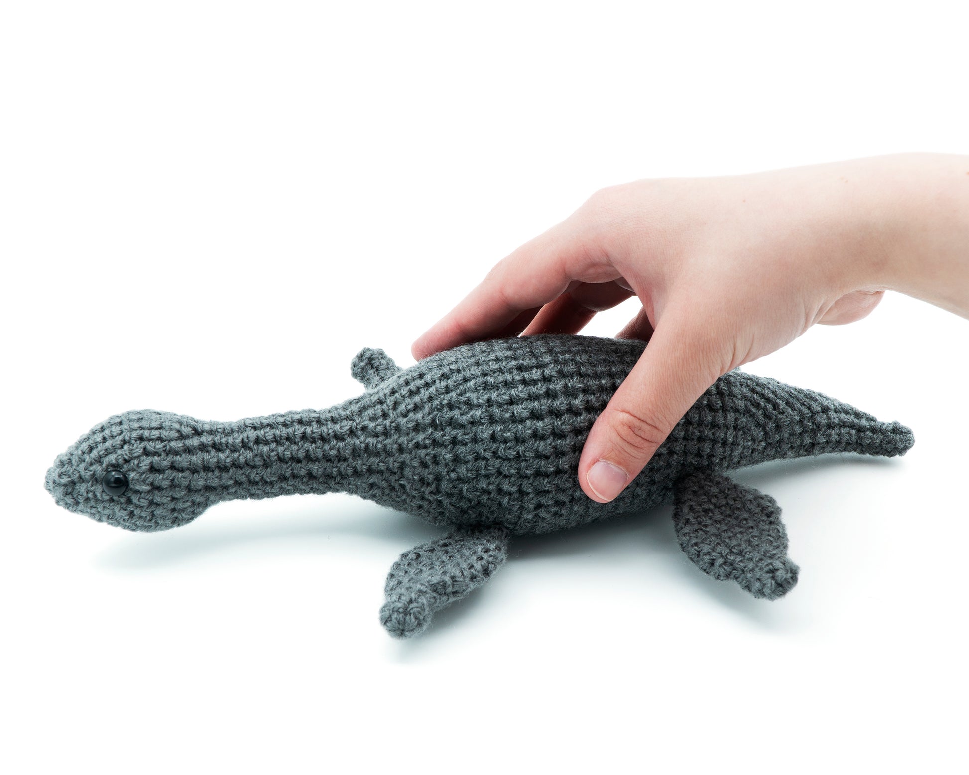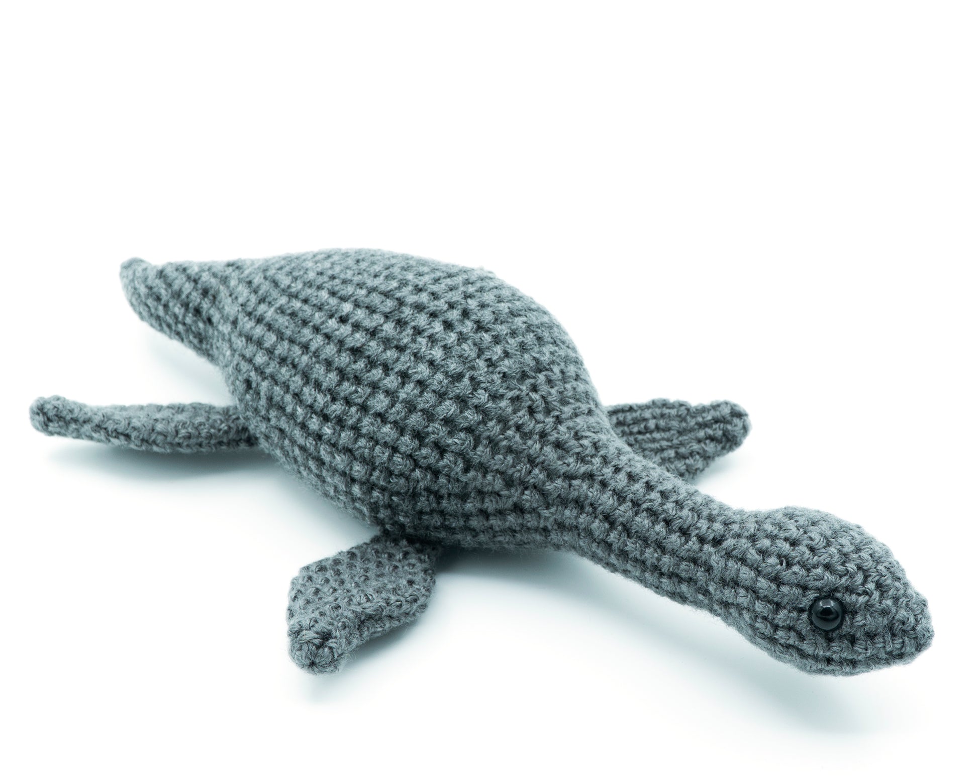 If the recommended size yarn and hook are used this crochet Plesiosaurus will be approximately 29.2 cm (11.5 inches) long by 5.7 cm (2.25 inches) tall.