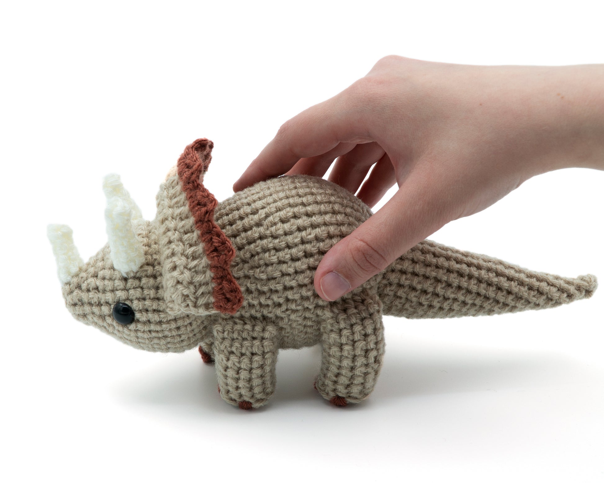 If the recommended size yarn and hook are used this crochet Triceratops will be approximately 25.4 cm (10 inches) long by 11.4 cm (4.5 inches) tall including the head crest.