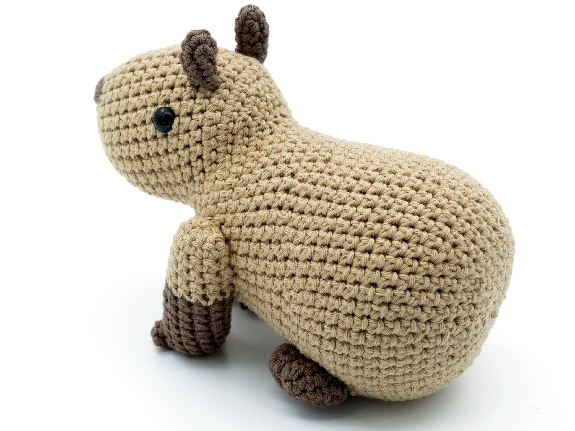 If the recommended size yarn and hook are used this crochet capybara will be approximately 15 cm (5.9 inches) tall by 17 cm (6.7 inches) long.