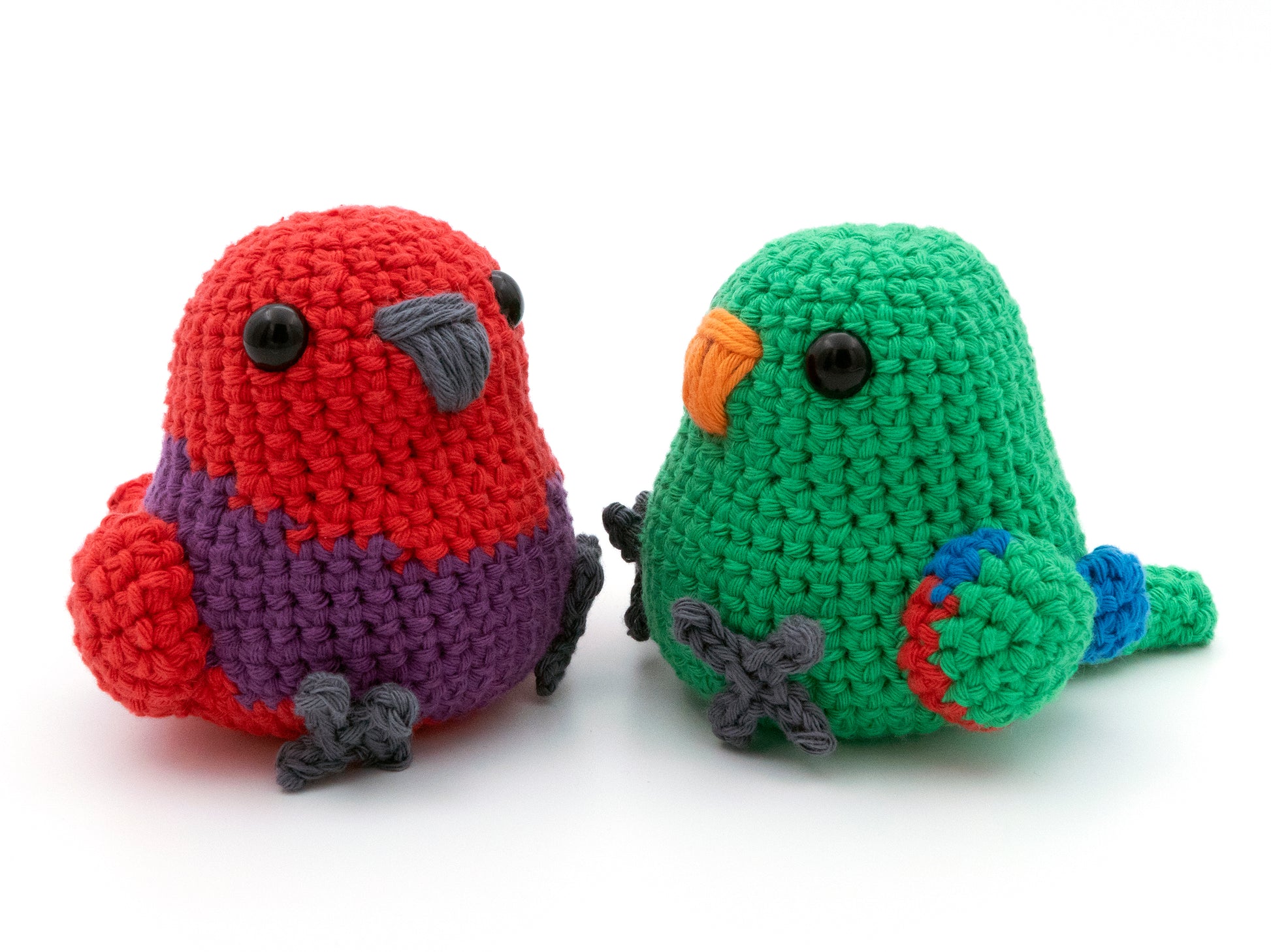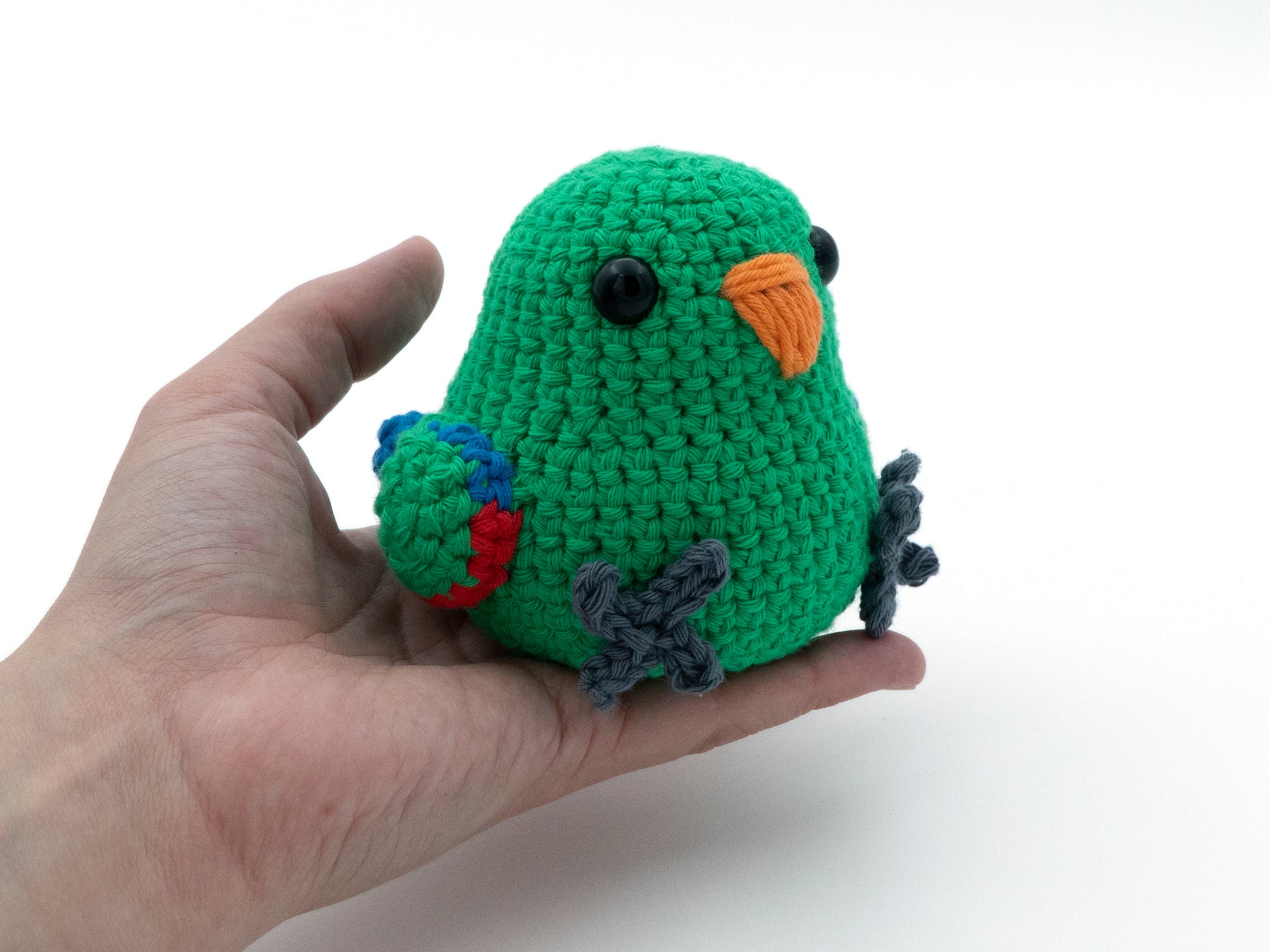 If the recommended hook and yarn size are used this male and female Eclectus parrot plush will be approximately 10 cm (3.9 inches) tall by 10 cm (39 inches) wide.