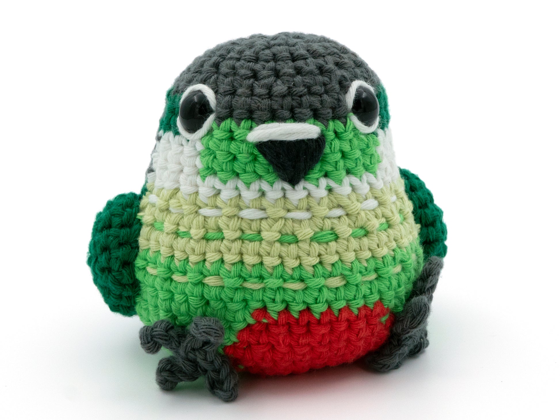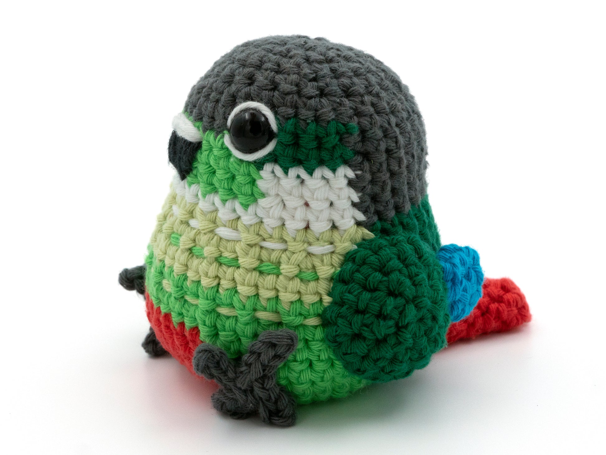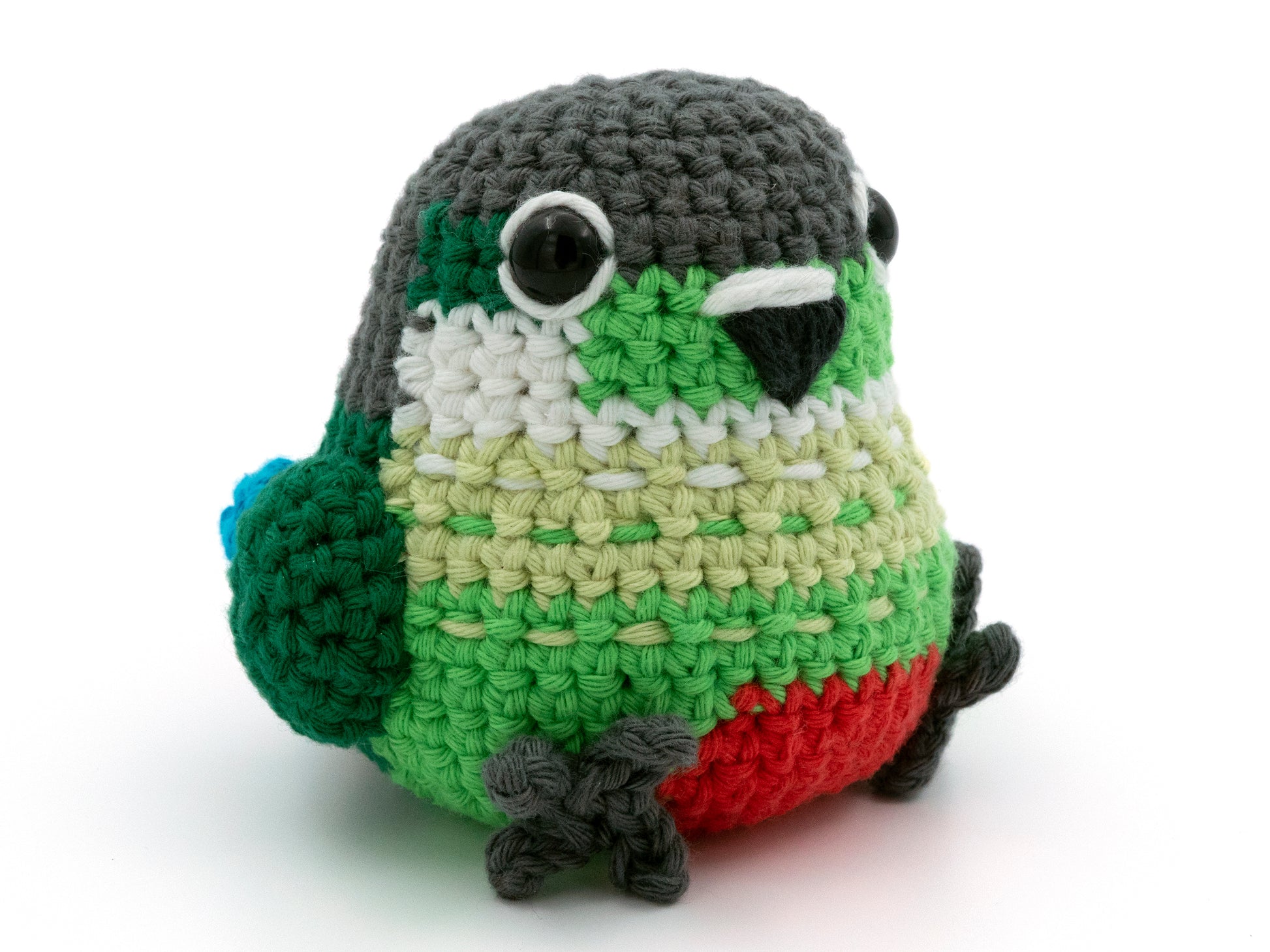 This amigurumi green-cheek conure pattern is written in English and uses US crochet terms.