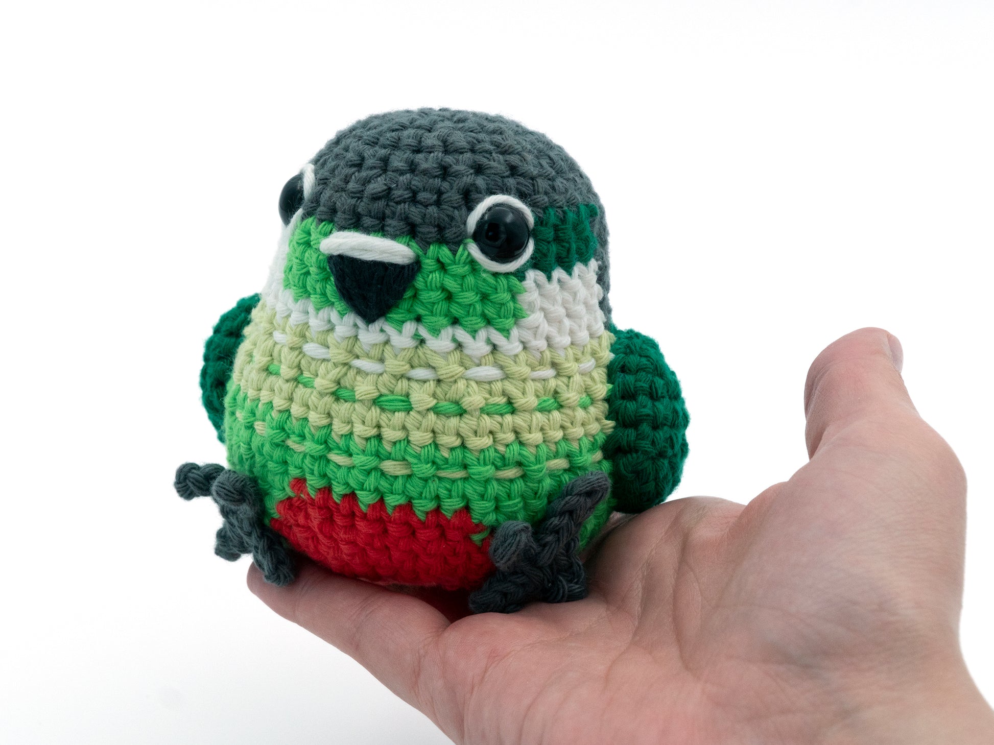 If the recommended hook and yarn size are used the green-cheek conure plush will be approximately 10 cm (3.9 inches) tall and 10 cm (3.9 inches) wide.