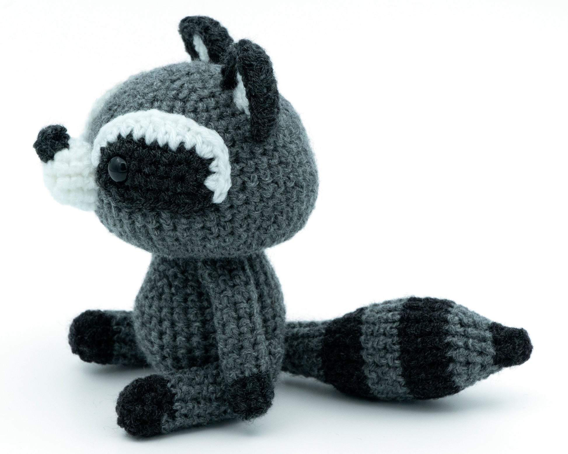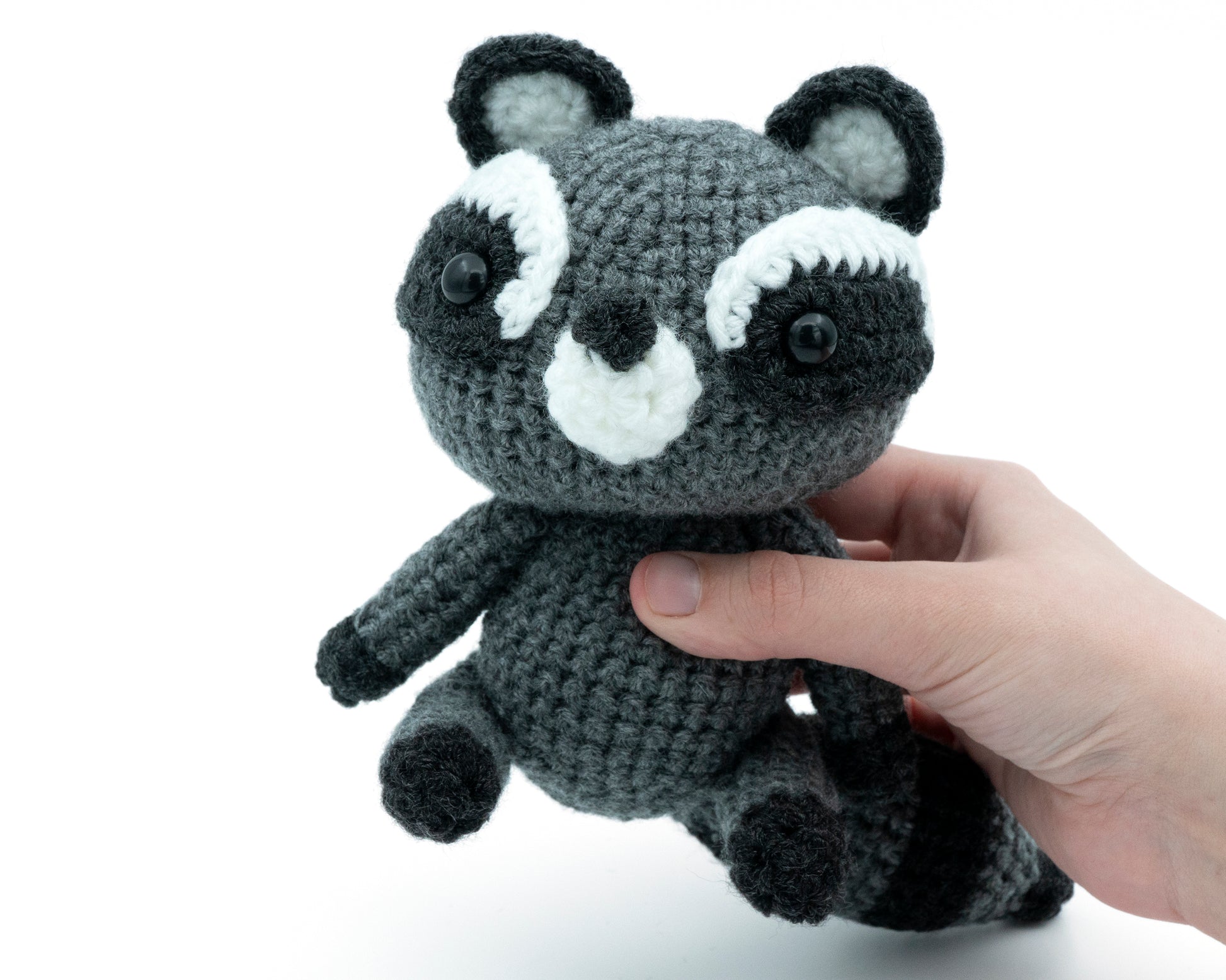 If the recommended size yarn and hook are used this crochet raccoon will be approximately 13.9 cm (5.5 inches) tall by 10.1 cm (4 inches) wide.