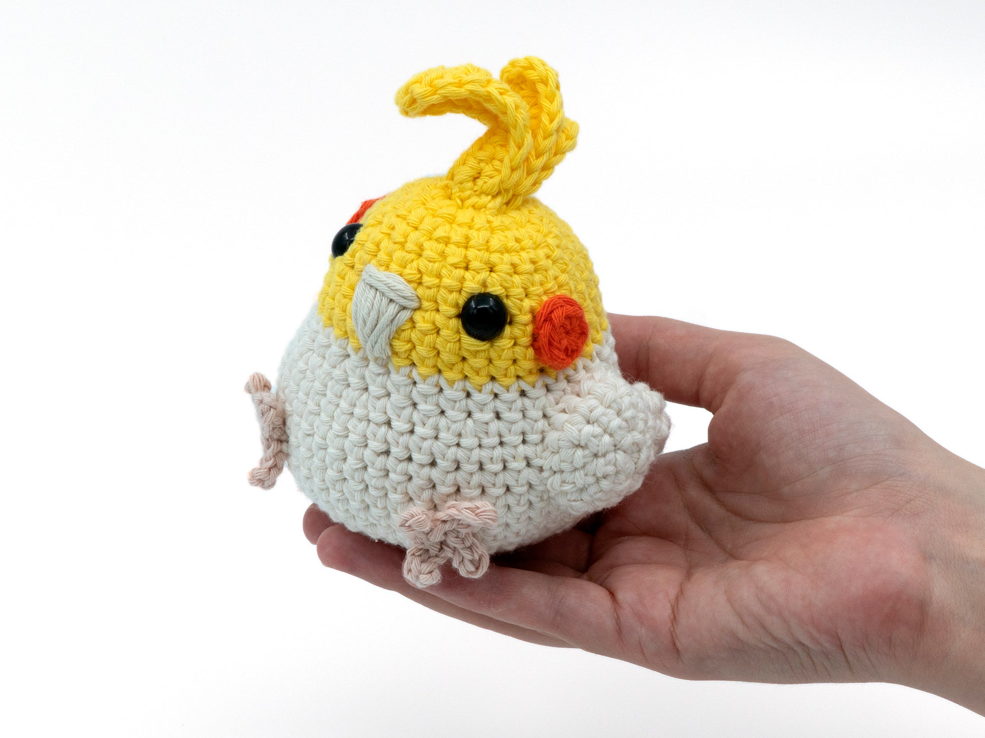 This crocheted cockatiel plush is approximately 10 cm (3.9 inches) tall (not including the head crest) by 10 cm (3.9 inches) wide.